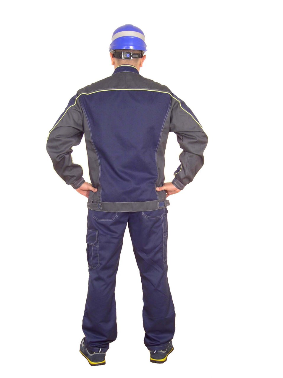 Цвет: основной темно-синий в сочетании с серым. Двойная отстрочка швов и основных элементов светло серой контрастной усиленной нитью.