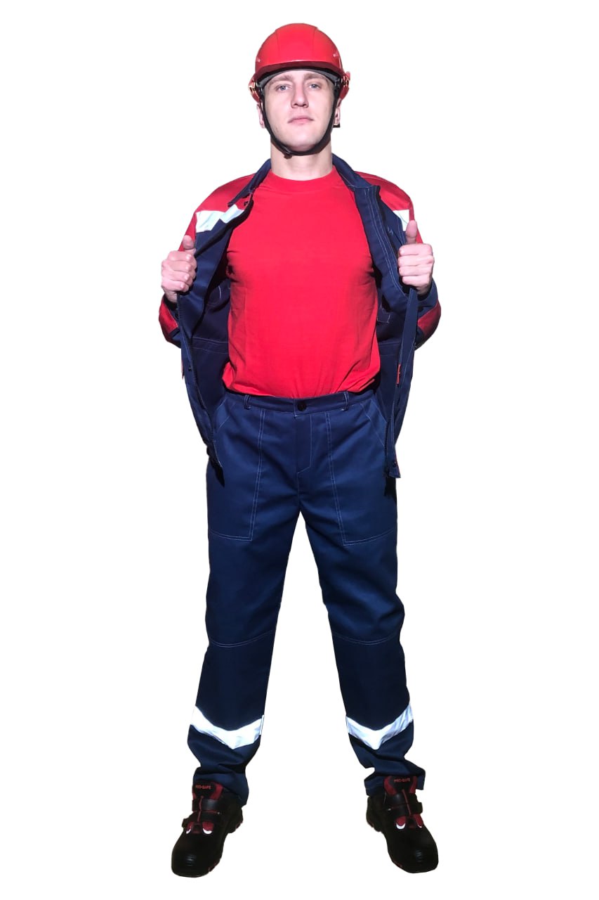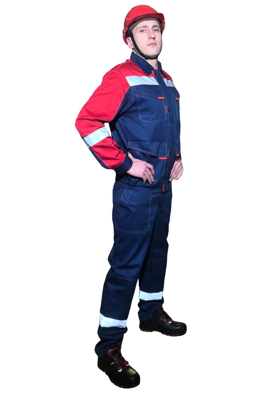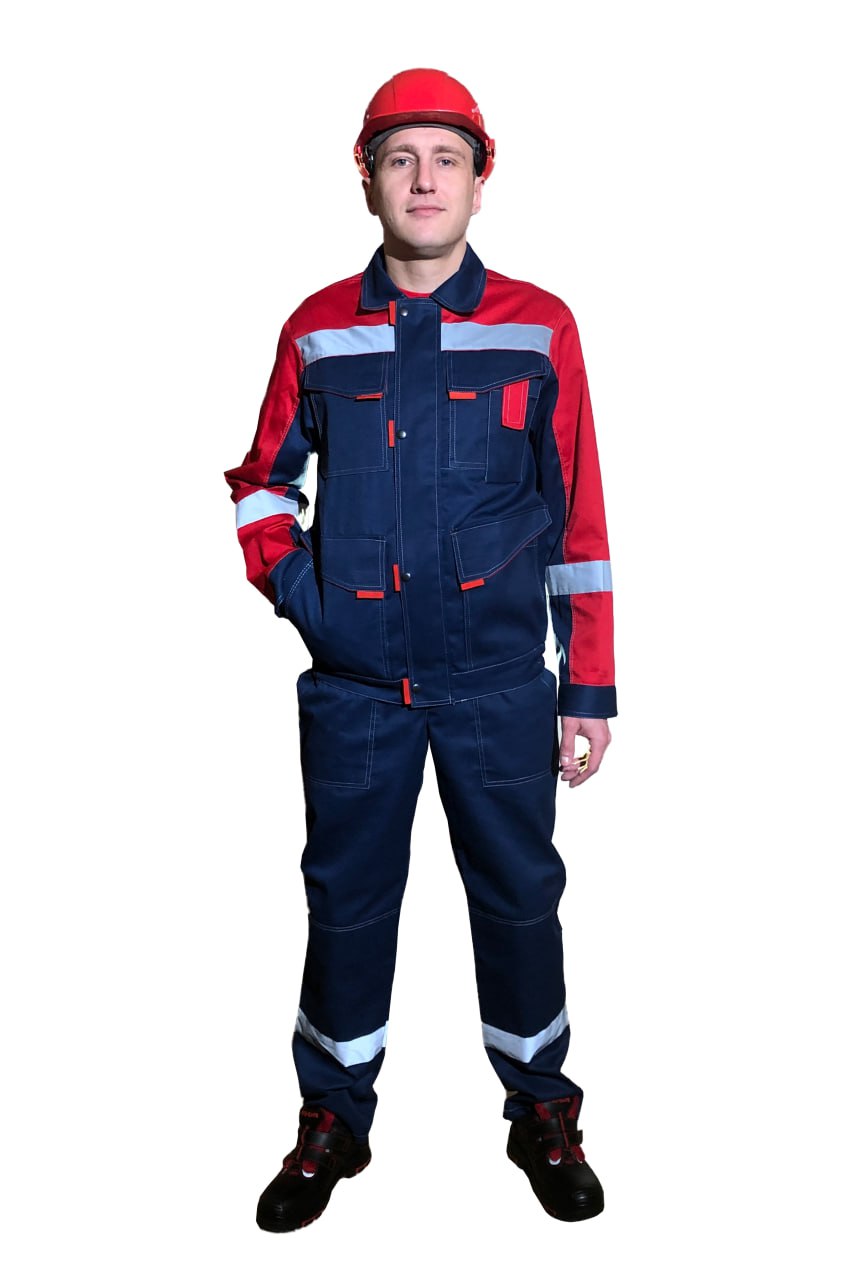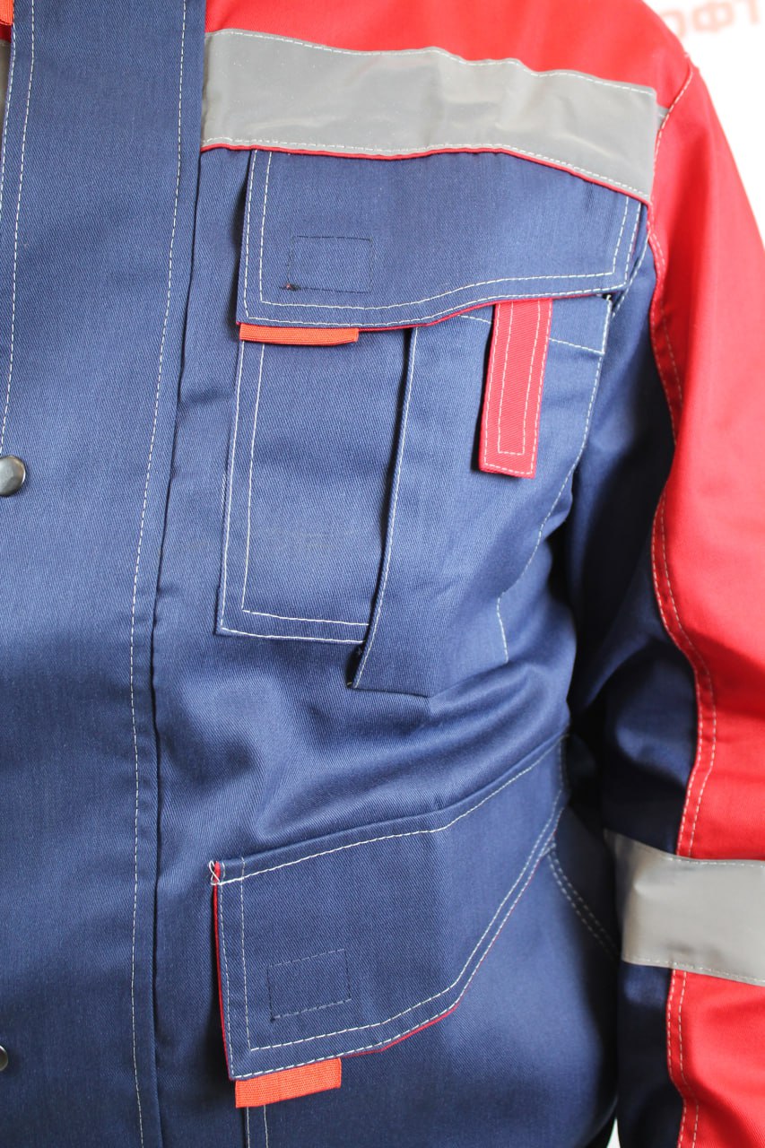 Цвет: основной темно-синий в сочетании с красным. Двойная отстрочка швов и основных элементов светло серой контрастной усиленной нитью.