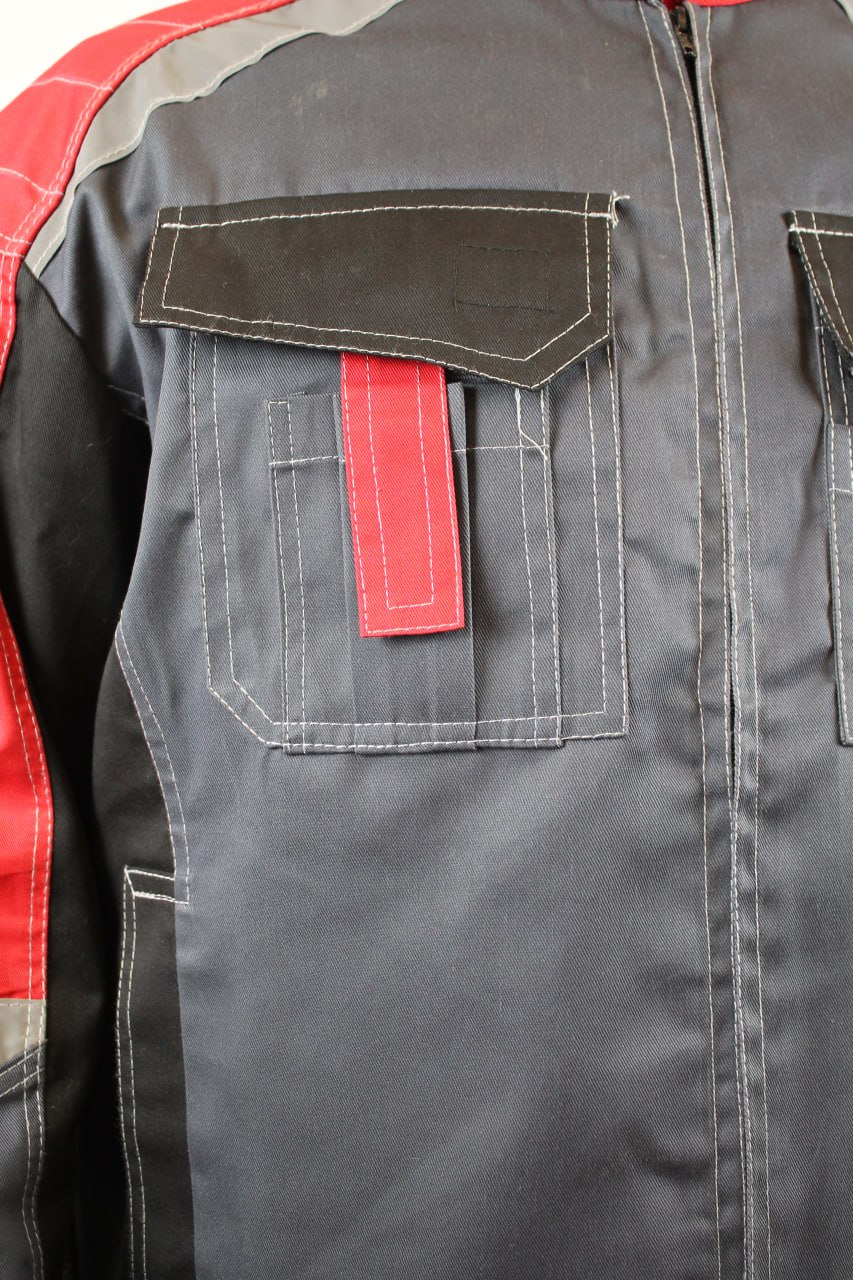 Карманы: два внутренних боковых кармана с косым входом на передних половинках, накладные на задних половинках для инструментов